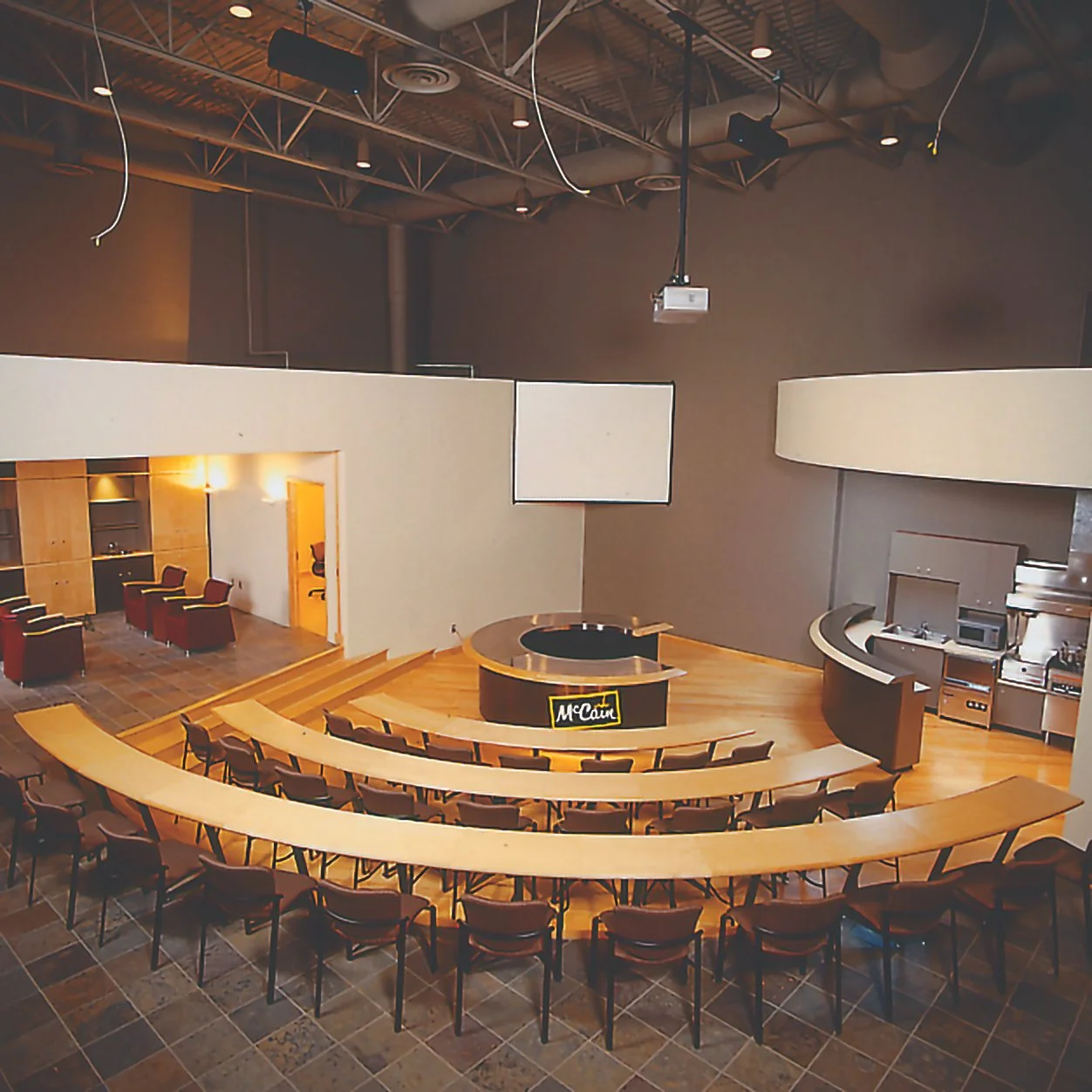 The McCain Media Centre apart of the McCain plant located outside of Lethbridge, Alberta. AtlantexCreativeWorks outfitted McCain with a custom podium, an interpretive wall detailing the process of creating french fries and a global map wall, complete with a series of light up pegs denoting the locations of McCain plants all over the world.